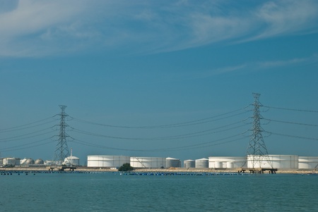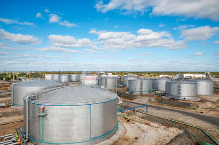 large tanks for petrol and oil, against cloudy sky