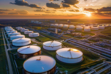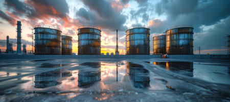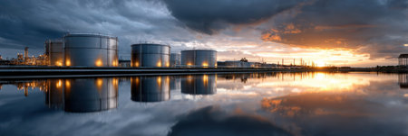 A serene view of industrial storage tanks illuminated by the soft glow of sunrise, reflecting beautifully on calm waters, showcasing nature's harmony with industry.