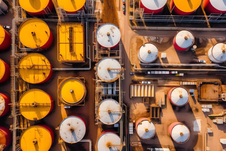 Aerial top view of oil tanks of petrochemical industry, gas storages of chemical petroleum factory. Concept of fuel, refinery plant, company, technology, energy. Generative AI