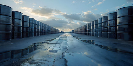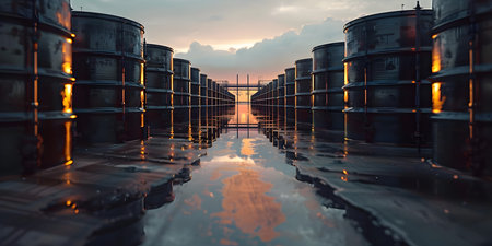 Industrial oil barrels stand on a wet concrete surface, reflecting the twilight sky and a nearby refinery in a panoramic view.