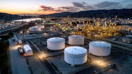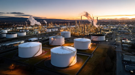 An aerial perspective capturing the intricate structures of industrial oil storage tanks and refineries at dusk, showcasing urban energy production.