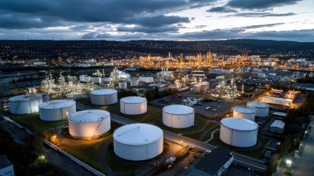 A captivating aerial view showcases a landscape of industrial oil storage tanks surrounded by a vibrant city skyline illuminated at dusk, highlighting energy production.