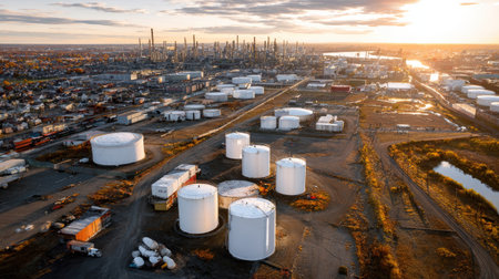 This aerial photo captures the expansive view of large oil storage tanks lit by evening sunlight, set against an industrial skyline, showcasing energy management and infrastructure.