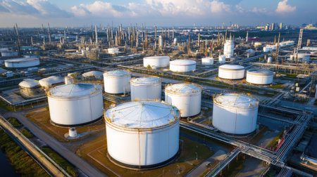 An aerial view showcasing large oil storage tanks in a sprawling industrial refinery environment, emphasizing the scale and complexity of energy production infrastructure.