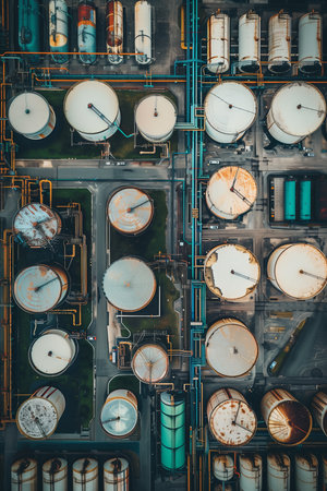 This aerial image captures a vibrant industrial facility with colorful storage tanks and intricate machinery, showcasing the oil and gas sector's operations.
