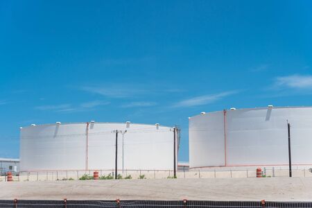 White oil storage tank with stairs under cloud blue sky in Corpus Christi, Texas, America. Large industrial container for petrol, oil, natural gas. Tank farm at petrochemical, oil refinery plant