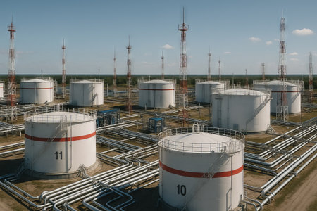An aerial view of a fuel storage terminal with numerous large tanks arranged in rows. Piping systems connect the tanks, indicating logistics operations taking place.