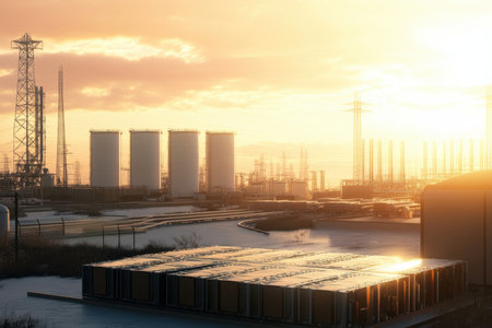 Sunset casts a warm glow over an industrial area with storage tanks, power towers, and shipping containers.