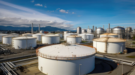 Generative AI Aerial view of a petrol chemical processing plant and storage facilities.