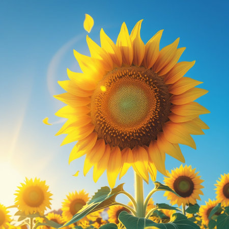 A bright sunflower stands out against a lush green field full of blooming sunflowers. The sun shines down, creating a cheerful, summery atmosphere filled with warmth.