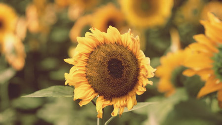 Majestic agricultural landscape, farming view with sunflowers field and beautiful sky. Vintage stylization, retro film filter