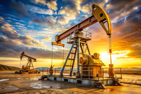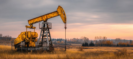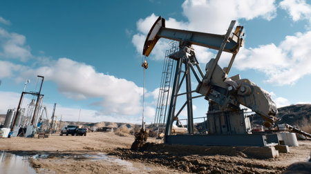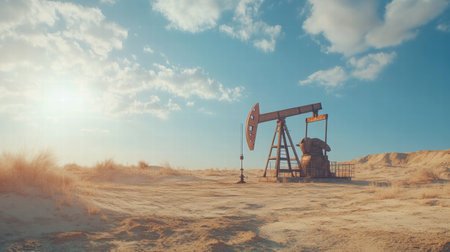 An oil pump jack stands solitary in a dry landscape, surrounded by sparse vegetation and a dramatic sky. The scene captures the essence of energy extraction.