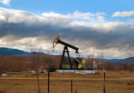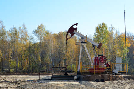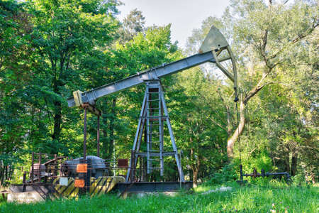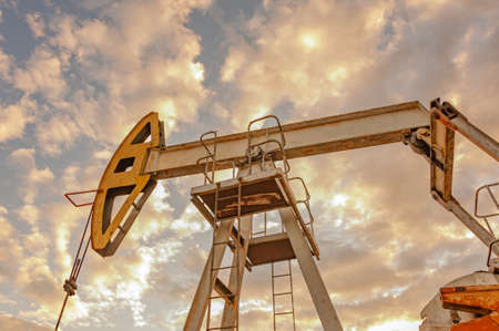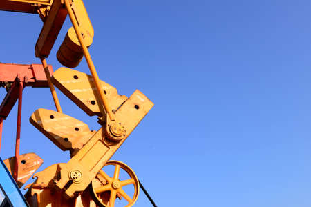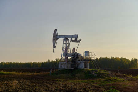 The oil pump, industrial equipment. Oil field site, oil pumps are running, Extraction of oil.