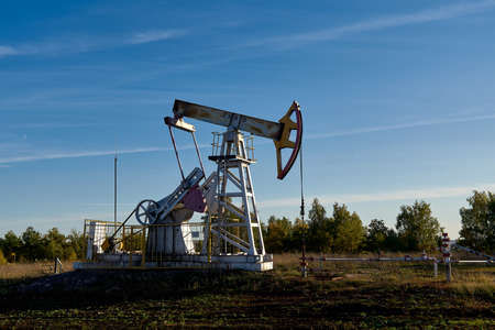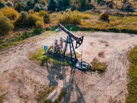 Oil pump, oil rig an industrial oil production standing in the field. Technology concept, fossil energy sources, hydrocarbons. Mixed media copy space.