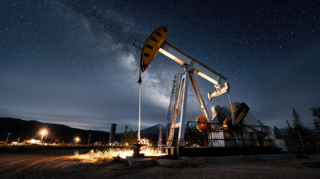 An oil pump operates under the starry night sky, showcasing the beauty of industrial machinery against a breathtaking Milky Way backdrop.
