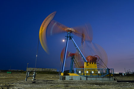 Oil pumping machinery in operation, crude oil extraction scene in the night, North China
