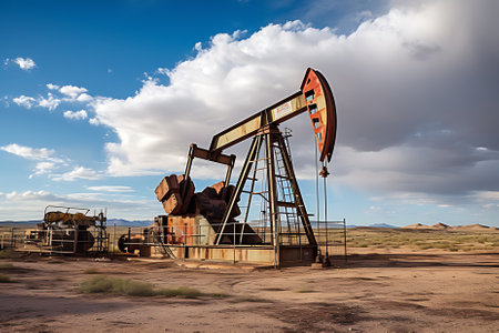 An oil operates well in the arid desert, extracting natural resources amidst the dry terrain and soft clouds in the sky.