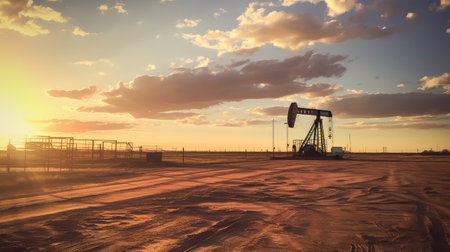 A stunning sunset casts long shadows across a dusty oil field featuring an oil pump jack. The scene highlights the contrast between nature and industrial activity, showcasing the energy industry in a remote rural location.