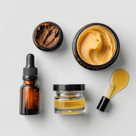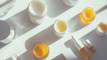 Variety of skin care products such as jars, oils, and serums displayed on a white surface, providing ample room for text insertion or branding.