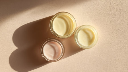 Three jars containing different skincare creams rest on a smooth beige surface, illuminated by warm afternoon light creating soft shadows.