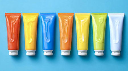 Seven vibrant paint tubes lined horizontally on a blue background, showcasing a rainbow of colors for art, school projects, diy crafts, studio work, creativity and design inspiration