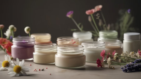 Four jars of cosmetic cream of different colors with a flowers background. Herbal cosmetics concept.