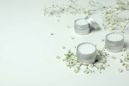 Eco lip balm and flowers on white background