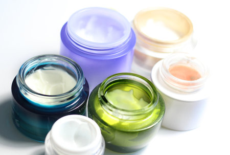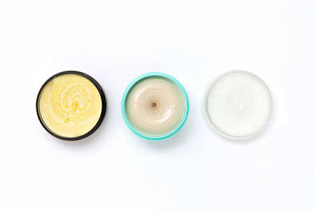 Set of opened multi-colored jars with white cosmetic cream for face and body on a white background,