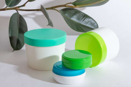 Top view of a black turquoise and white jars with different cream on a white background. The concept of beauty, medicine, facial and body skin care, hair care