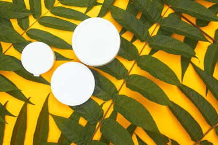Natural cosmetics with nettle leaves. mock up cream jar and nettle leaves, skin care and hair treatment. yellow background