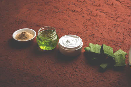 Jars of moisturizing white cream and green aloe gel on a palm leaf. Different moisturizers for different areas of the face on a brown background with copyspace.