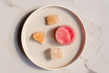 Himalayan salt and pink body or face scrub on ceramic round tray on marble background. Bath salt. Spa treatment. beauty and relaxation concept