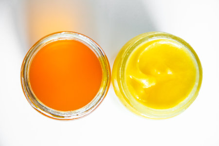 A closeup, overhead shot features a container of creamy, swirled yellow substance. The lighting highlights the smooth texture and swirl pattern. It could be a dessert topping or cosmetic cream.