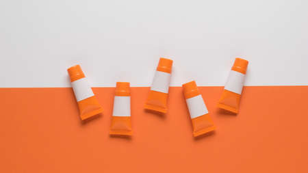 Orange tubes with white templates for names on a white and orange background. Creative image. Flat lay.