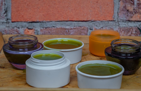 Home made marijuana medical salve with color brick wall indoor