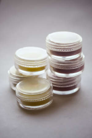 jars with colored cosmetic lip balm on a light background, lip care