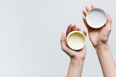 top view of woman holding jars with cosmetic cream isolated on white