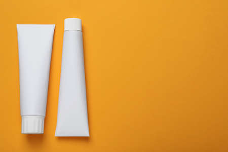 Blank tubes of toothpaste on orange background, flat lay. Space for text