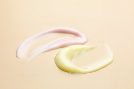 Artful flat lay of cosmetic textures: clear gels, smooth creams, and colorful beads on a clean surface, perfect for beauty, wellness, and scientific product showcases.