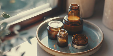 Natural Skincare Products in Brown Glass Jars on Ceramic Plate by Sunny Window.