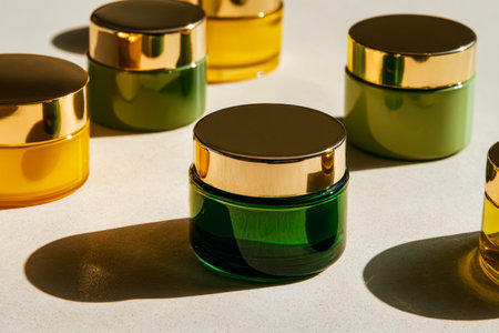 A sophisticated array of jewel-toned containers featuring gleaming golden caps, soft shadows, and warm ambient light to evoke a luxurious skincare collection setup.