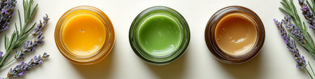 Colorful glass jars containing various cosmetics for face care emphasize natural ingredients and aesthetic appeal. Placement includes lavender and herbs enhancing beauty routine and self care.