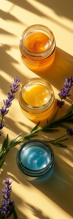 Colorful glass jars containing cosmetics for face care and skin care sit against a sunny backdrop. Fresh lavender sprigs and green herbs accentuate the arrangement, creating a calming feel.