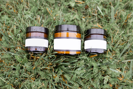 Bottles with empty stickers to copy paste lying on the green grass