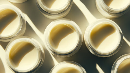Multiple body cream jars lined up diagonally with sunlight casting soft shadows