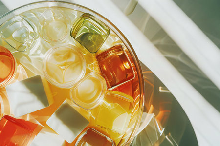 Colorful ice cubes in a glass on a white background. Toned.