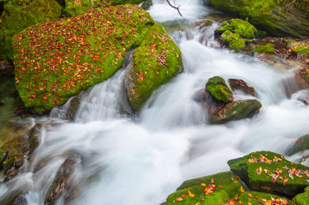 Oirase Mountain Stream flow rapidly passing green mossy rocks covered with falling leaves in the colorful foliage of autumn season forest at Oirase Gorge in Towada Hachimantai National Park, Aomori Prefecture, Japan.