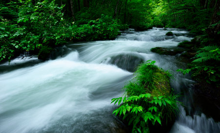 A forest river flowing between rocks with moss and green vegetation in the morning sun, a natural backdrop. Oirase Stream, Aomori, Japan.