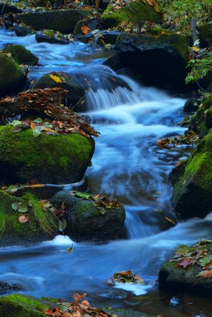 Long exposure of the mountain river flowing through the woods with autumn leaves