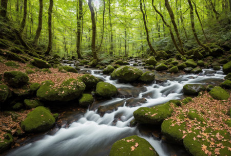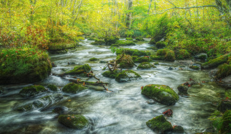 A forest river flowing between rocks with moss and green vegetation in the morning sun, a natural backdrop. Oirase Stream, Aomori, Japan.